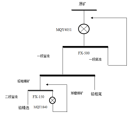 破碎后的礦石自粉礦倉下端的皮帶給料機(B=800㎜ L=1.5m)給入5、6#皮帶運輸機(B=800㎜ L=38m),經5、6#皮帶輸送至球磨(Ф4000×5100㎜)內,給礦的同時按比例加入給礦水,以控制磨礦濃度在80%左右,礦石在球磨機內經鋼球沖擊研磨后排出到圓筒篩上,大于圓筒篩篩孔的礦石及碎小鋼球排到“頑石”筒后,再吊運回球磨機,小于圓筒篩篩孔的礦石隨礦漿自流到砂泵池內,礦漿經稀釋水稀釋后由渣漿泵在一定的壓力(壓力=0.04-0.09MPa)、濃度(濃度=58±2%)條件下揚送至Ф500㎜旋流器內進行分級,合格粒級產品(-200目60%±2)從旋流器溢流管排出,自流到除屑篩上,將礦漿中的木屑、導爆索等各種雜質分離出來。礦漿從除屑篩下自流到鉛浮選調漿槽。不合格粒級產品,從旋流器沉沙嘴排出,自流返回到球磨機內,構成閉路循環。