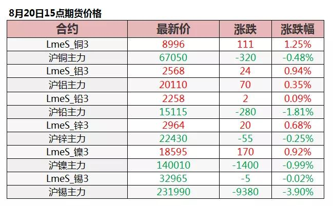 ? ? ??截止日間收盤各主力合約表現(xiàn)如下:國際銅漲 0.46%,滬銅漲 0.61%,滬鋁漲 0.8%,滬鉛跌 2.26%,滬鋅漲 0.09%,滬鎳跌 0.86%,滬錫跌 3.64%。銅方面,今日倉單報價 105-140 美元/噸,均價較前一交易日上調(diào) 17.5 美元/噸;提單報價 90-120 美元/噸,均價較前一交易日上調(diào) 20 美元/噸,QP9 月,報價參考 9 月到港貨源。LME 0-3 貼水 0 美元/噸,進口盈利在 100 元/噸附近。? ? ? 鋁方面,今日鋁價小幅回漲,SMM A00 鋁價較昨日漲 20 元/噸至 20100 元/噸,再生鋁價則相對穩(wěn)定。國內(nèi)價格上,國內(nèi)大型再生鋁企業(yè)報價不變,含一月賬期運費價約 19450-19750/噸;中小廠方面,報價上調(diào) 100 元/噸至 19100-19300 元/噸。進出口方面,當前進口鋁錠到貨依然偏少,價格相對穩(wěn)定,進口即時虧損小幅擴大。